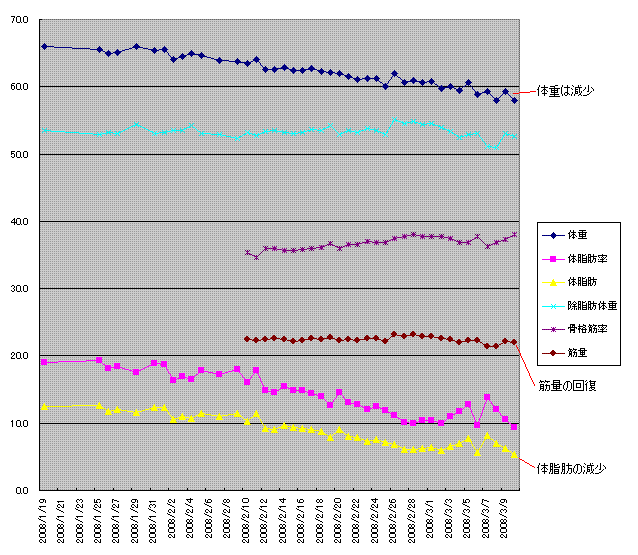 体重58.0(59.3) 体脂肪率9.3(10.5) 骨格筋38(37.3) 内臓脂肪レベル3 体年齢19(21) ()内は昨日の朝 ##体脂肪量激減した キンリョウは増加。ほぼ理想値 けっきょく、食べれば痩せられたのにもったいないことをした。 計算では800g程度脂肪が消えたことに。昨日はマイナス700キロカロリなのでせいぜい100なのだが、水泳の消費カロリーが思った以上に大きいのかもしれない。 あと、筋肉グリコーゲン補充すれば筋肉は減らないこと、水泳前に食べてもきちんと痩せることがわかった 今後はなるべく小分けして食べて備蓄しないようにしたい あと水泳前後には食べること